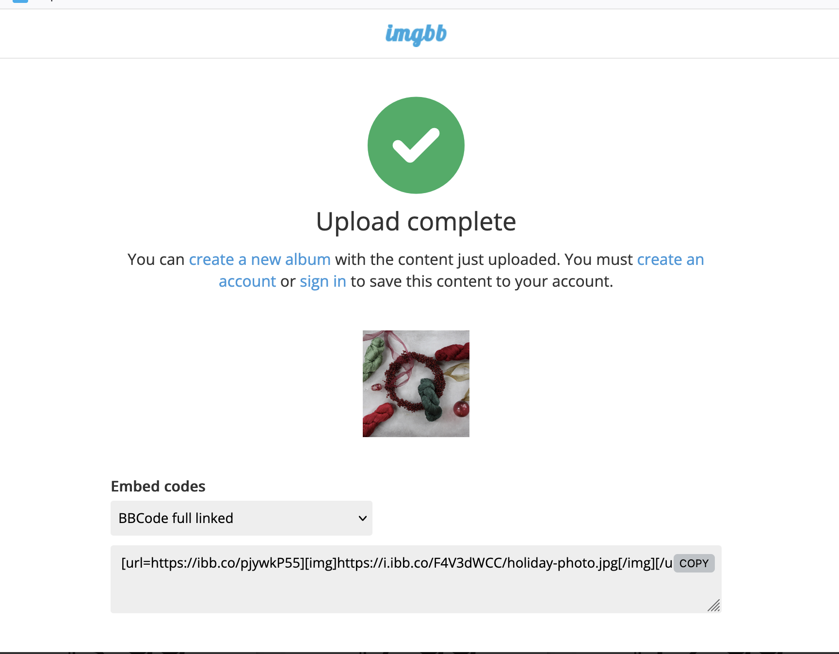 Once your image is uploaded to ImgBB click on Embed codes and choose 'BBCode full linked', copy the code and paste in your comment on the forum. If you have more than one photo, you'll need to repeat the process for each one.